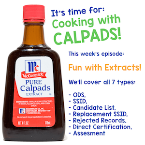 There are 9 types of CALPADS Extract files: 1. ODS Extracts 2. SSID Extract 3. Candidate List Extract 4. Replacement SSID Extract 5. Rejected Records Extract 6. Direct Certification Extract 7. Assessment - Student Results Extract New! 8. Assessment - Individual Student Results Extract New! 9. Suspense Resolution Records Type #1 - "Operational Data Store or 'O.D.S.' extract" Generating an ODS extract is useful if you want to compare the data in CALPADS to what is in your own SIS system. Since an ODS extract pulls out the "live" data, you can match what is in CALPADS to your own data to make sure you have enrolled or exited all of the students correctly, to identify students who might be participating in a program, determine the EL status, etc. There are 13 different types of ODS extract files. They are virtually identical to the files used to upload data to the calpads system from your student information system, with three differences: the ODS Extract file is structured like the input file with the addition of two fields, (A) the upload date and (B) the last date updated, at the end of each record. Additionally, the (C) Record Type Code will have a ‘-R’ appended to the Input Record Type Code. ODS Extract Record Type Codes # Record Type Input Record Type Code ODS Extract Record Type Code 1 SSID Enrollment SENR SENR-R 2 Student Information SINF SINF-R 3 Student English Language Acquisition SELA SELA-R 4 Student Program SPRG SPRG-R 5 Student Discipline SDIS SDIS-R 6 Student Waivers SWAV SWAV-R 7 Staff Demographics SDEM SDEM-R 8 Staff Assignment SASS SASS-R 9 Course Section Enrollment CRSE CRSE-R 10 Course Section Completion CRSC CRSC-R 11 Student Course Section Enrollment SCSE SCSE-R 12 Student Course Section Completion SCSC SCSC-R 13 Student Career Technical Education SCTE SCTE-R Type #2 - "SSID extract" An LEA may request an extract of their "State Student Identifier Number" or "SSID" information from the CALPADS portal. CALPADS will create the extract file according to the user’s specified selection criteria. The SSIDs in the file may be imported into a local student information system and/or used locally on the user’s personal computing system. The file will contain a list of SSIDs and limited demographics based on the selected filter criteria defined by the LEA. CALPADS will extract ONLY THE SSIDs associated with the students currently enrolled in the LEA. The content of the SSID Extract file is listed in the table below. SSID Extract Record Layout # CALPADS File Element Field Type Max Length Business Rule 1 Reporting LEA CS 7 This will default to the institution identifier of the User ID. May not be blank. 2 School of Attendance CS 7 The 7 digit code associated with the student’s school of attendance. May not be blank. 3 SSID CS 10 The SSID for the student. If the SSID associated with the enrollment is retired, the system will populate the SSID field with the active SSID associated with the retired...